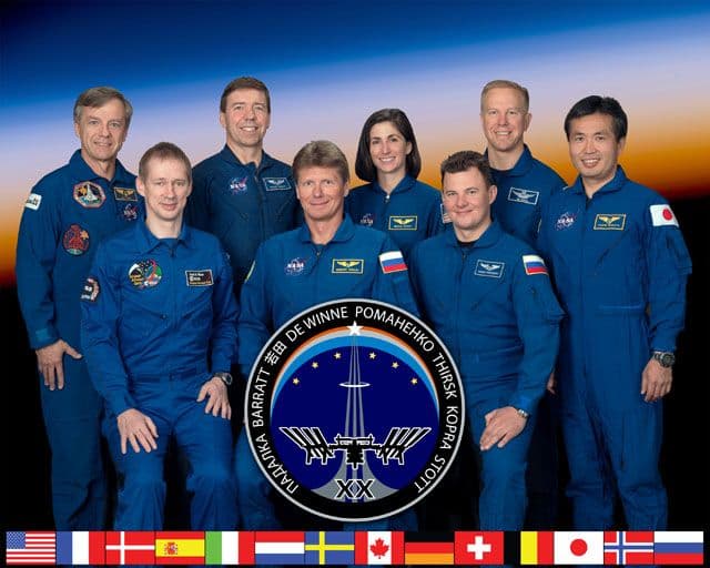 Expedition 20 crewmembers take a break from training at NASA's Johnson Space Center to pose for a crew portrait. From the left (front row) are European Space Agency astronaut Frank De Winne, Expedition 20 flight engineer and Expedition 21 commander; cosmonaut Gennady Padalka, Expedition 19/20 commander; and cosmonaut Roman Romanenko, Expedition 20/21 flight engineer. From the left (back row) are Canadian Space Agency astronaut Robert Thirsk, Expedition 20/21 flight engineer; NASA astronauts Michael Barratt, Expedition 19/20 flight engineer; Nicole Stott, Expedition 20/21 flight engineer; Tim Kopra, Expedition 20 flight engineer; and Japan Aerospace Exploration Agency (JAXA) astronaut Koichi Wakata, 18/19/20 flight engineer.